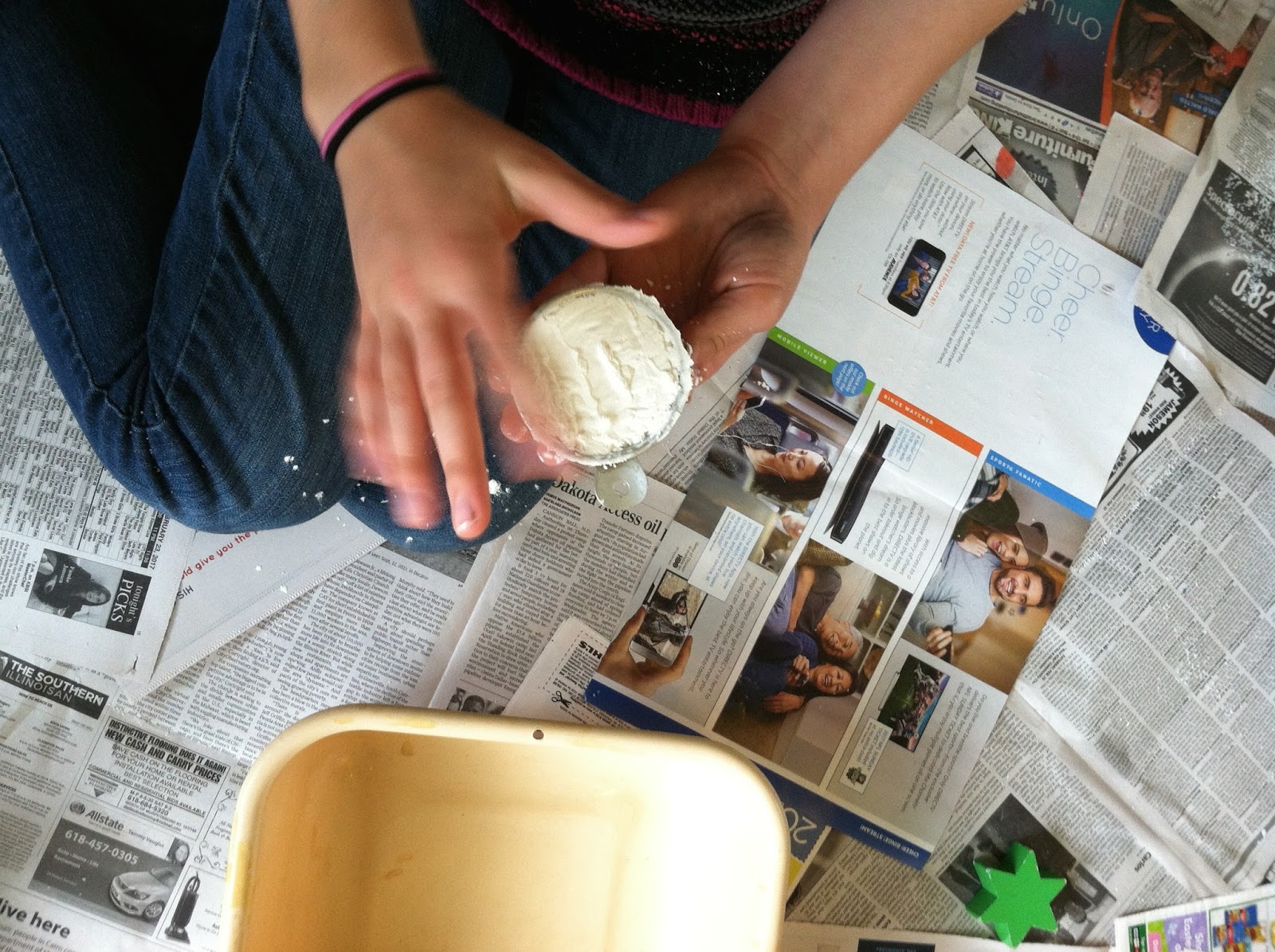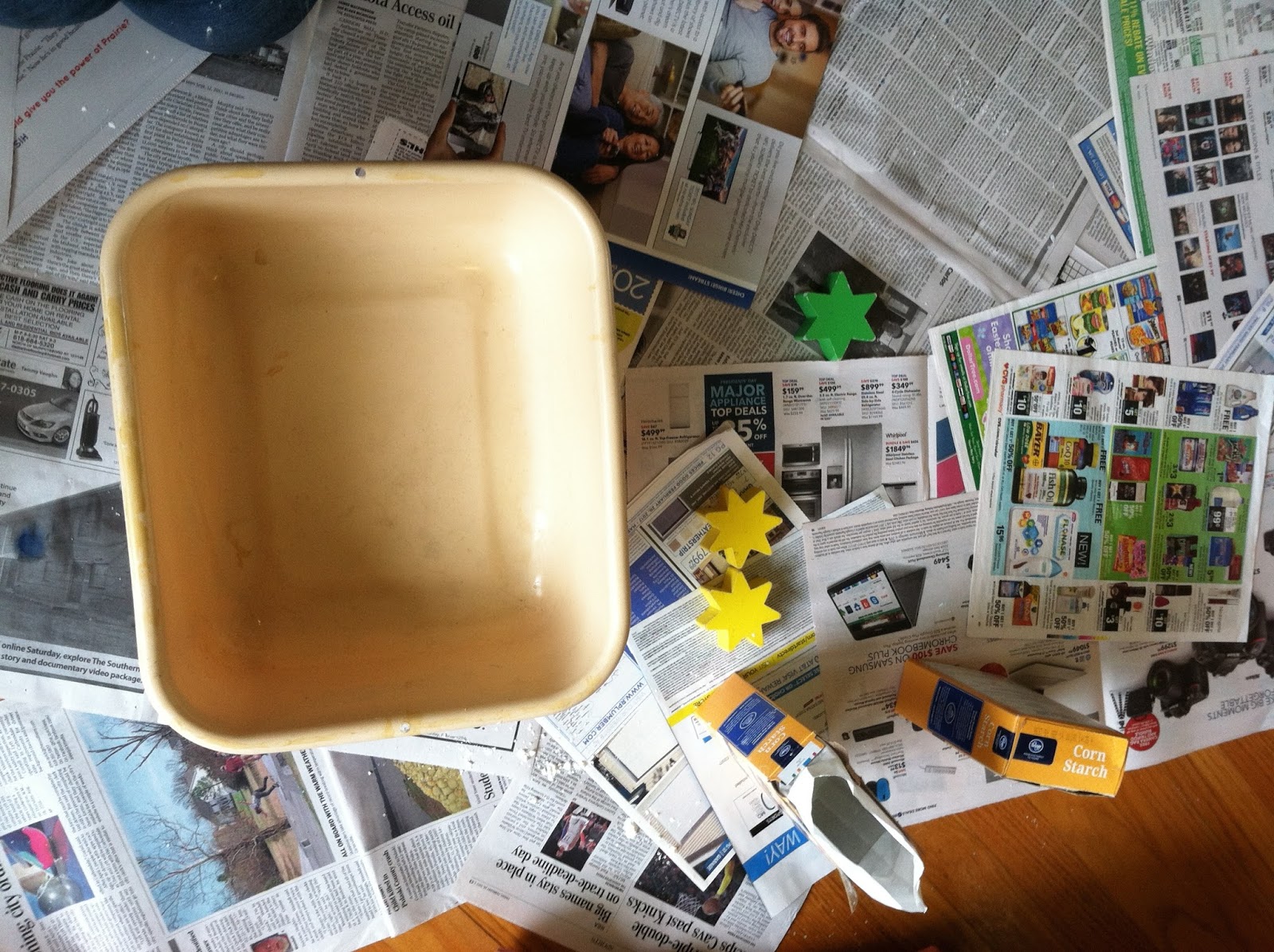 For clean up you MUST use a DRY paper towel. Clean off your hands well with the dry paper towel and throw it in the trash. Scoop the oobleck out of your bowl with a spoon and throw it in the trash.